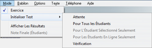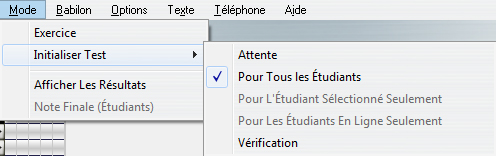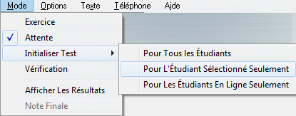 Pour démarrer le test pour cet étudiant, sélectionnez Mode > Initialiser Test > Pour l'Étudiant Sélectionné dans la barre de menus supérieure. Le message d'attente disparait de l'écran de l'étudiant et le test démarre.